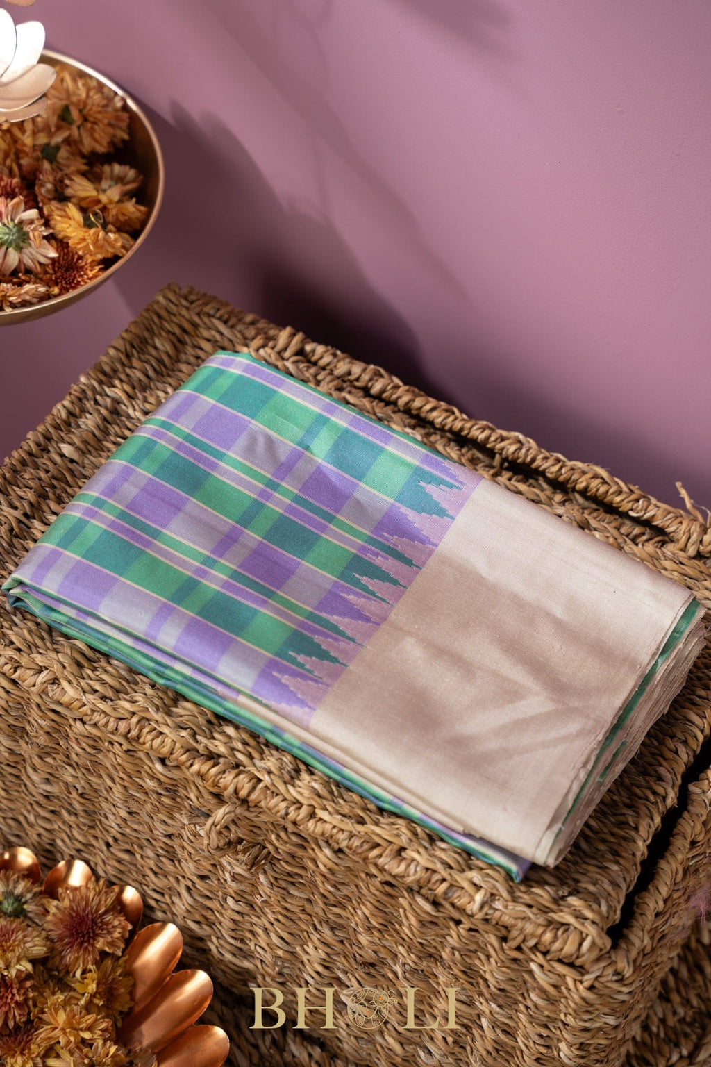 Discover the timeless elegance of this checkered blue Gadwal saree, crafted without zari for a refined, understated look. The traditional Gadwal weave showcases intricate geometric patterns in soothing blue tones, perfect for both everyday wear and special occasions. Known for its lightweight cotton-silk blend, this saree offers exceptional comfort and breathability while maintaining its graceful drape. The absence of zari keeps the design pure and sophisticated, allowing the beautiful checkered pattern to take center stage. Ideal for those who appreciate classic Indian craftsmanship with a modern sensibility.