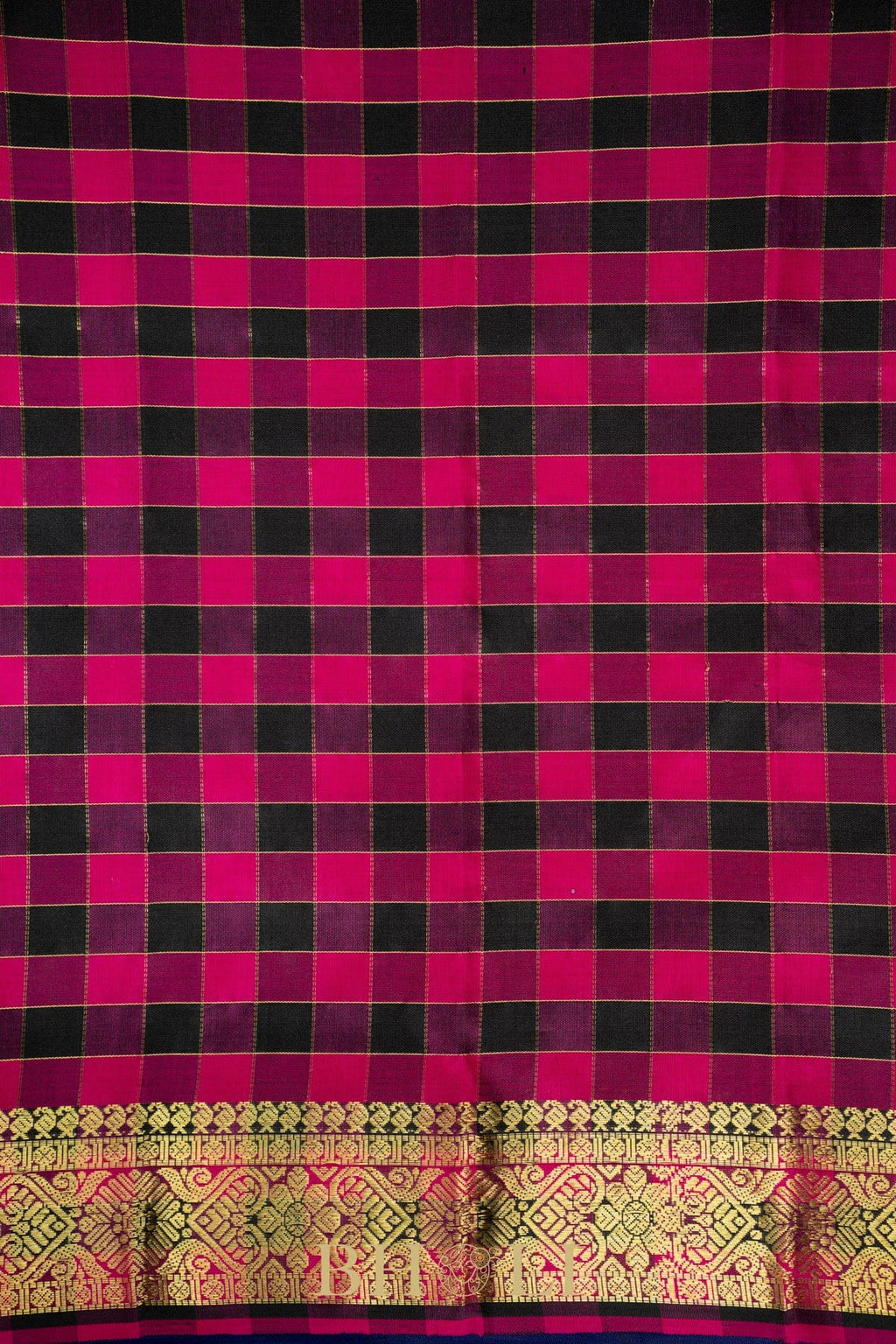 Elevate your ethnic wardrobe with this exquisite Kuttu Gadwal saree, where timeless craftsmanship meets contemporary elegance. The striking checkered pallu features a sophisticated interplay of deep blue and vibrant raspberry pink, creating a refined color palette that transitions beautifully from day to evening wear. Woven with the lightweight durability Gadwal is renowned for, this saree drapes gracefully while maintaining its structured integrity. The intricate checkered pattern adds visual depth and texture, making it an ideal choice for festive occasions, celebrations, or refined everyday styling. Perfect for those who appreciate traditional artistry with a modern sensibility.
