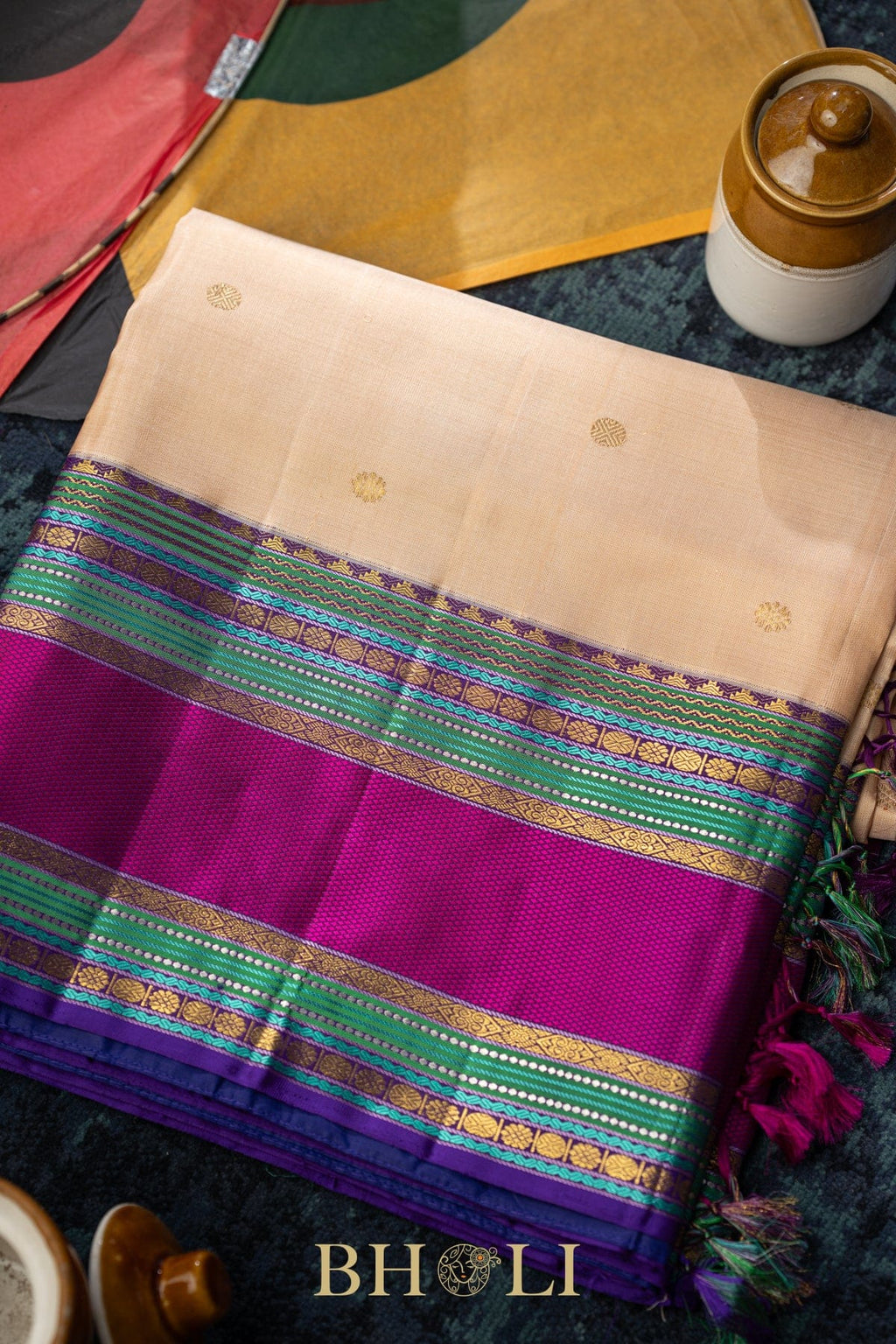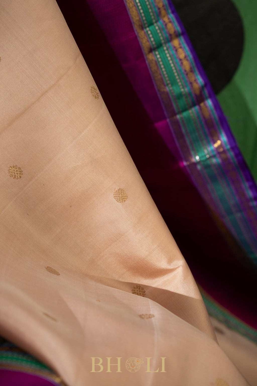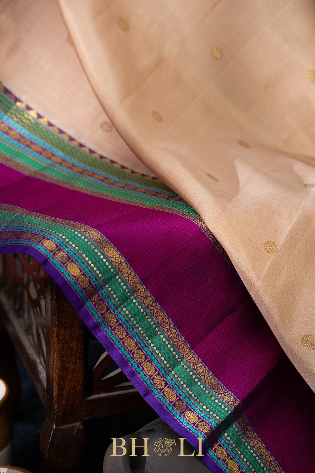 Discover the timeless elegance of this classic Korvai Kanjivaram saree, crafted from luxurious mulberry silk with authentic pure zari work. This exceptional piece features an unusual color palette and distinctive design that sets it apart from traditional patterns, making it perfect for those seeking something truly special. The intricate korvai weaving technique ensures durability and a graceful drape, while the rich silk fabric offers unmatched comfort and sophistication. Ideal for weddings, celebrations, or elevating your everyday wardrobe with heritage craftsmanship.