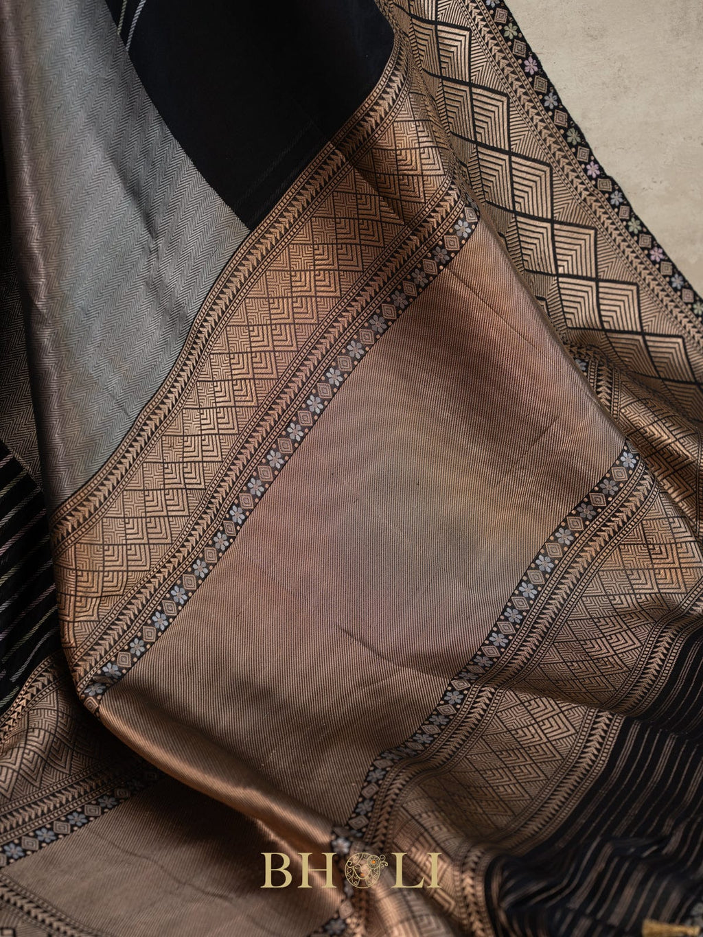 Experience timeless elegance with this conceptual pure Katan silk black Banarasi saree. Crafted from luxurious Katan silk, it features intricate Banarasi weaving that adds depth and sophistication. The rich black hue enhances its regal appeal, making it perfect for formal occasions. This saree blends traditional artistry with contemporary design, offering a graceful drape that complements your refined style.
