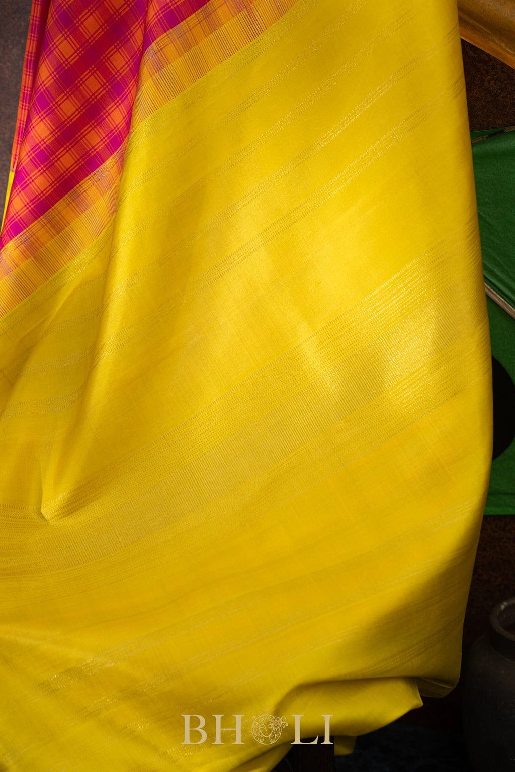 Celebrate timeless elegance with this stunning Ganga Jamuna checkered body Korvai Kanjivaram saree. Featuring the iconic dual-color checkered pattern that symbolizes the sacred rivers, this traditional silk saree showcases authentic Korvai weaving—a labor-intensive technique where the borders and body are woven together as one piece. The intricate checks create beautiful visual depth, while the rich silk fabric drapes gracefully for any occasion. Perfect for weddings, festivals, or special celebrations, this saree honors classical South Indian craftsmanship. Pair it with traditional jewelry to complete your sophisticated look.