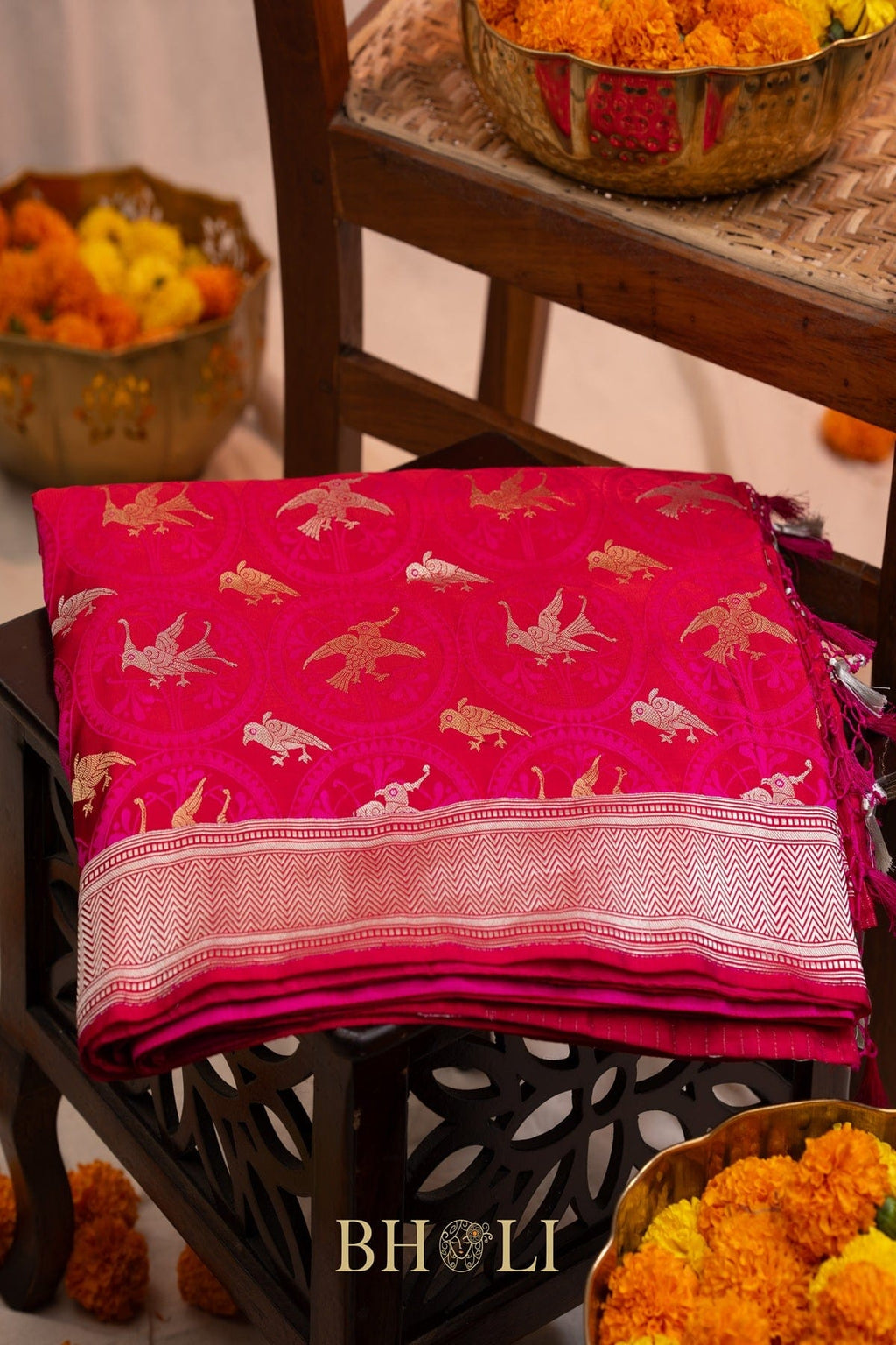 Step into charm with our handwoven designer Kaduwa Jungla, where intricate zari and thread work playfully dance across rich fabric. This saree’s exquisite craftsmanship adds a touch of whimsy to your wardrobe, perfect for turning heads and sparking conversations at any occasion. Celebrate tradition with a fresh, fun twist!