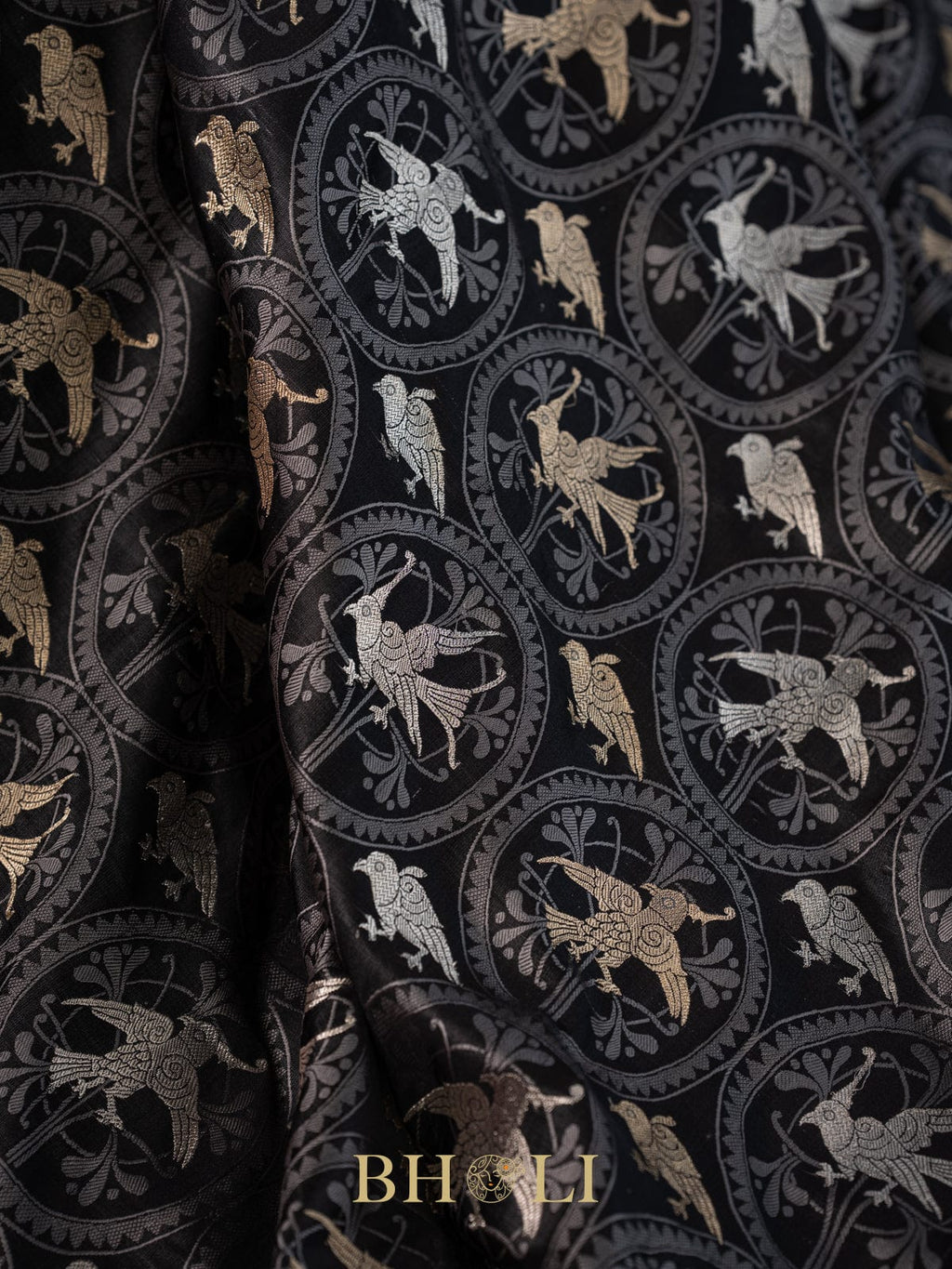 Dive into the charm of tradition with this handwoven Mashru Gaji Kaduwa Jungla Black Banarasi! Its rich black hues and intricate Banarasi patterns bring a dash of classic elegance to your wardrobe, while the cozy Mashru fabric adds a playful touch of comfort. Perfect for celebrations or turning heads on any day, this saree seamlessly blends heritage and style for a look that's uniquely yours.