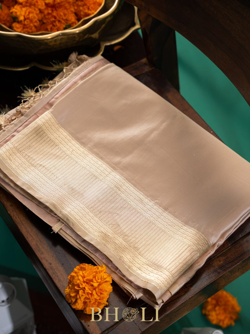 Experience the elegance of handwoven mashru silk Banarasi in a delicate biscuit color. This exquisite fabric combines traditional craftsmanship with a soft, versatile shade, offering both comfort and sophistication. Perfect for special occasions or everyday grace, it brings a timeless charm to your wardrobe.
