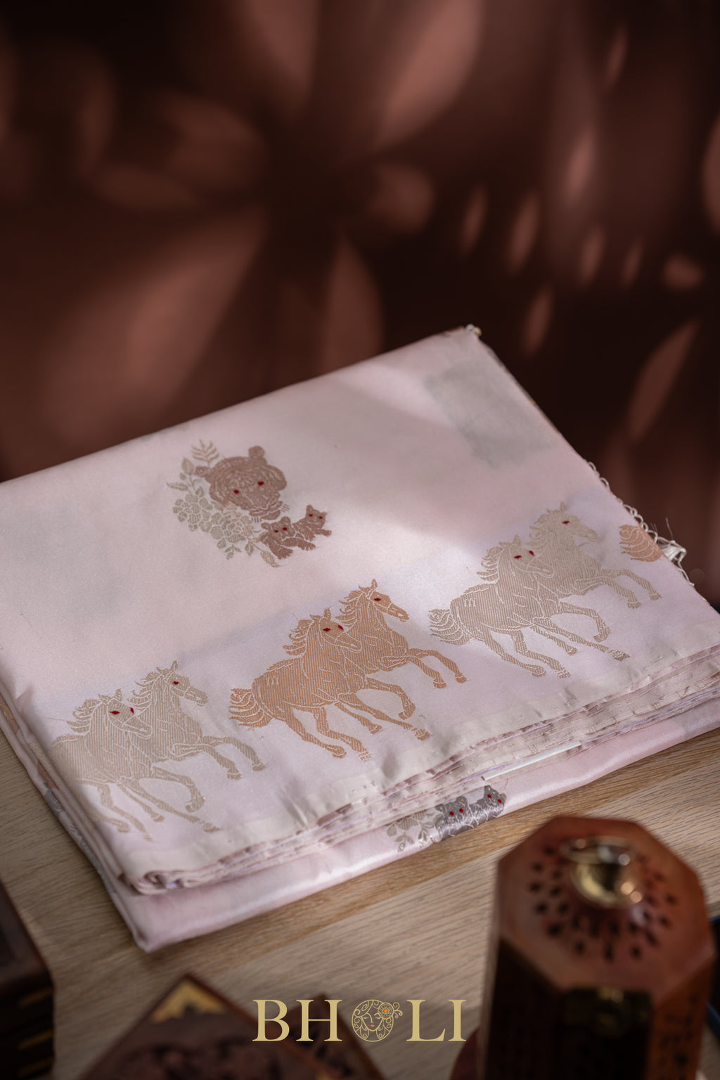 Handwoven with meticulous craftsmanship, this pure katan silk Banarasi saree features the timeless kaduwa buta pattern—delicate, intricate motifs that showcase traditional weaving excellence. Katan silk's natural lustre and smooth texture drape beautifully, offering comfort and elegance for special occasions. Each saree is a testament to generations of artisanal skill, making it a cherished addition to your collection. Perfect for celebrations, weddings, and moments that deserve authentic, handcrafted beauty.