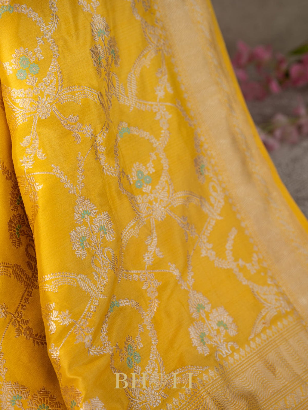 Wrap yourself in the vibrant charm of this handwoven Pure Katan Silk Meenakari Kaduwa Jungla Banarasi saree. With its intricate meenakari work and rich silk texture, it brings a playful twist to traditional elegance. Perfect for making every occasion sparkle, this saree combines classic craftsmanship with a dash of lively spirit.