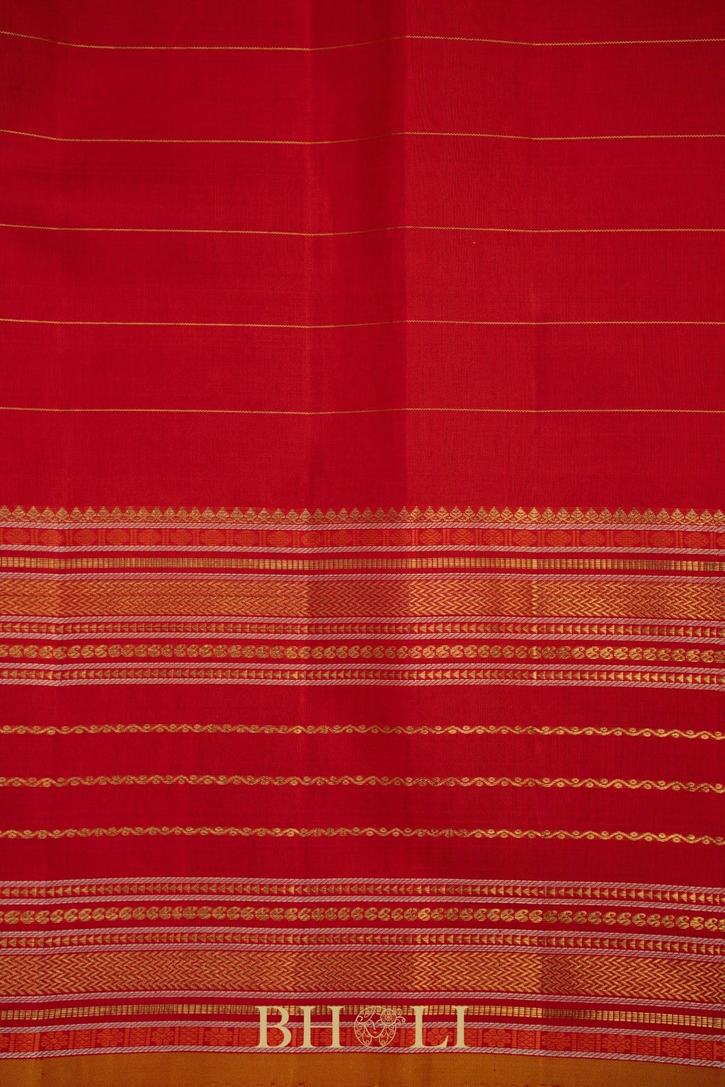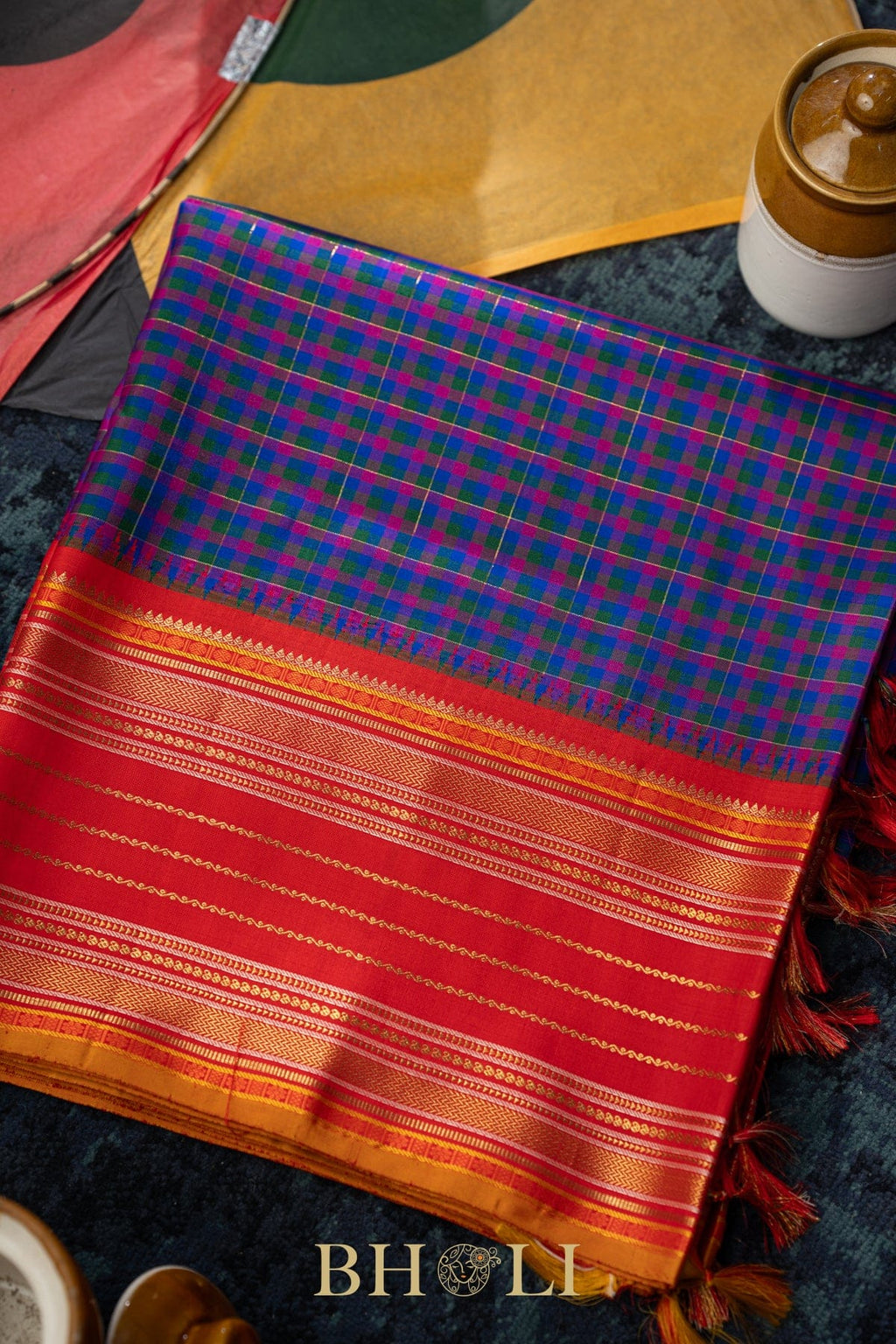 Elevate your ethnic wardrobe with this stunning handwoven Kanjivaram saree, where tradition meets timeless elegance. Crafted using the authentic korvai weaving technique, this piece features a striking checkered pattern adorned with pure zari that catches light beautifully. Each thread is meticulously woven to create a saree that's as comfortable as it is captivating. Perfect for weddings, festivals, or those moments when you want to feel absolutely radiant. A true collector's piece that celebrates the artistry of South Indian textile heritage.