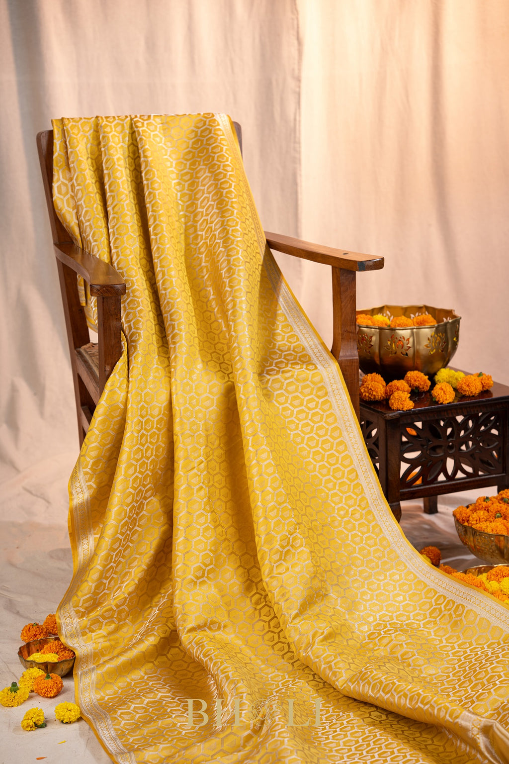 Dive into the charm of tradition with this handwoven Tanchoi Mashru Silk Banarasi. Soft yet rich, its intricate patterns promise to elevate your style with a playful nod to heritage. Perfect for those who love a blend of comfort and classic elegance in one stunning drape.