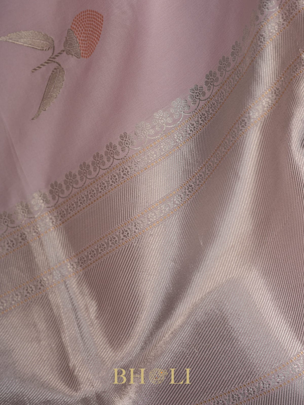 Experience timeless elegance with this lavender flowy pure Katan silk Banarasi saree, adorned with intricate Kaduwa Buta motifs. Crafted from high-quality silk, it offers a delicate sheen and soft drape, enhancing your graceful silhouette. Perfect for formal occasions, this saree blends traditional craftsmanship with refined style, making it a distinguished addition to your wardrobe.