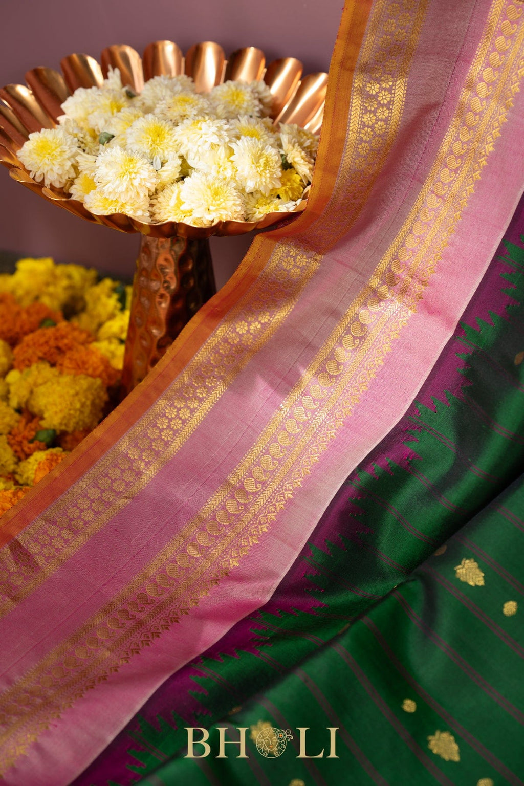 Drape yourself in timeless elegance with this stunning pure mulberry silk Kuttu Gadwal saree in rich emerald green. Crafted from the finest mulberry silk, this traditional weave showcases the intricate Kuttu Gadwal technique, known for its lightweight yet durable construction and subtle sheen. The luxurious emerald hue brings depth and sophistication to any occasion, whether you're attending a celebration or making a statement at a special event. Perfect for those who appreciate authentic craftsmanship and premium quality fabrics, this saree combines heritage weaving with modern sensibility. Experience the comfort and grace that comes with wearing genuine silk.