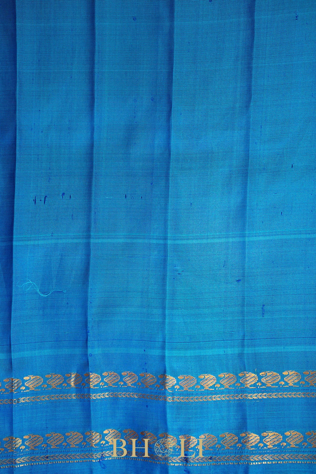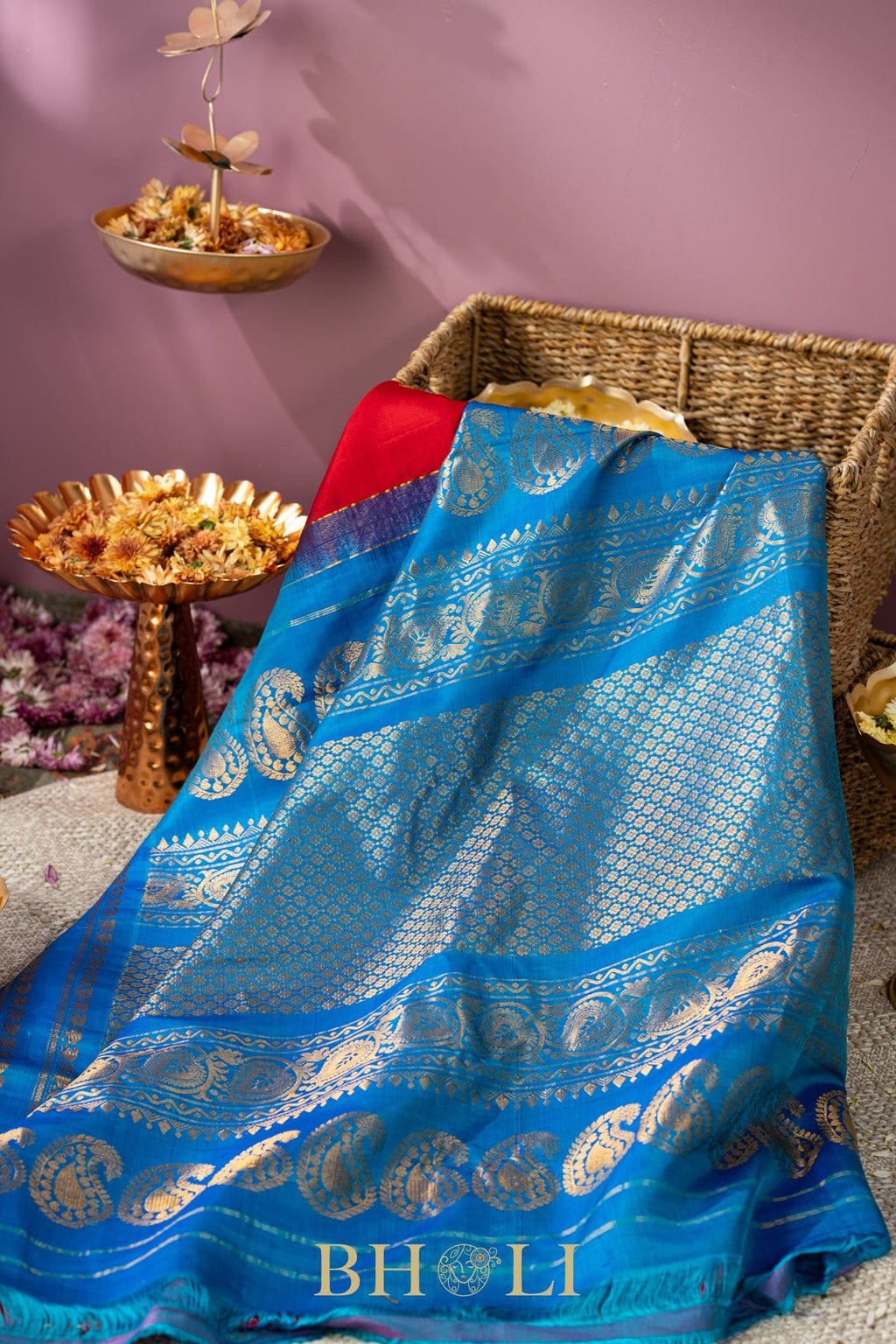 Elevate your saree collection with this stunning red and cerulean blue Gadwal silk saree, crafted from luxurious mulberry silk. The rich jewel tones create a captivating contrast that works beautifully for both traditional celebrations and contemporary occasions. Gadwal silk is renowned for its lightweight drape and natural sheen, making it comfortable to wear while maintaining an elegant silhouette. The vibrant color combination offers versatility in styling, allowing you to pair it with various blouse options and accessories. Perfect for someone seeking quality craftsmanship and timeless sophistication in their ethnic wardrobe.